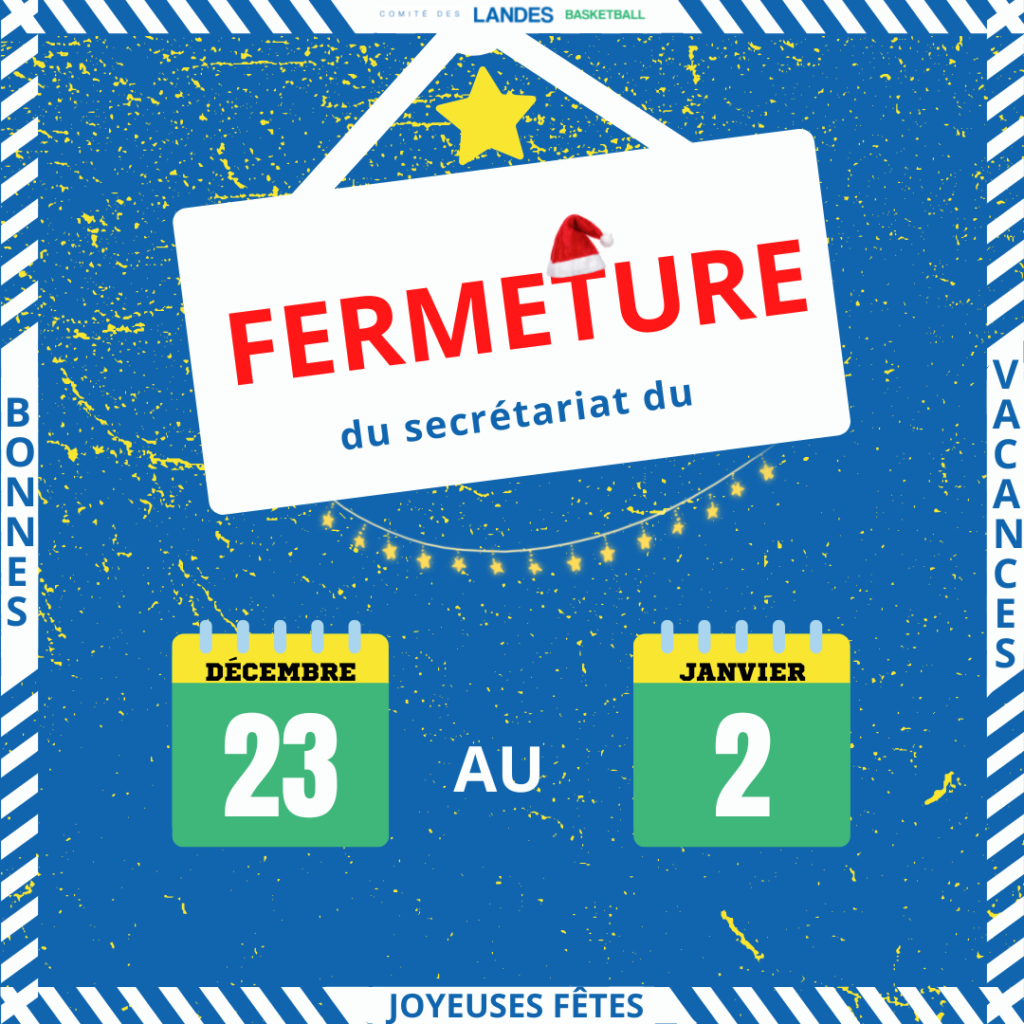 Le Comité des Landes de Basket, élus et salariés, vous souhaitent de bonnes fêtes de fin d’année et vous donnent rendez-vous début Janvier pour la 2ème partie de saison.
