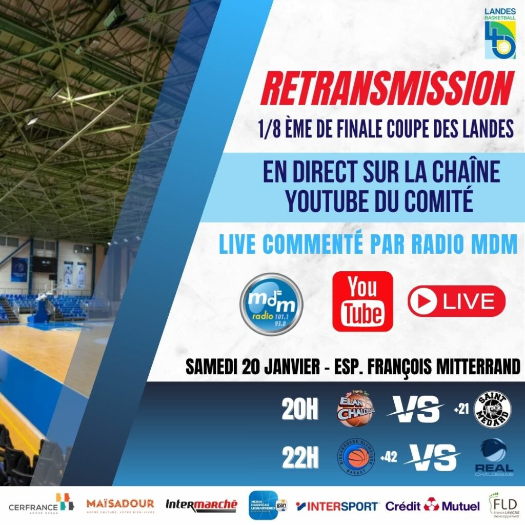 Les 2 rencontres (Elan Chalossais vs Saint Médard Basket // Biscarrosse Olympique Basket vs REAL Chalossais ) seront diffusées et commentées en direct sur la Chaine Youtube du Comité des Landes – Prise d’antenne à 19H50 – Un grand merci à Radio MdM pour l’apport dans cette diffusion!