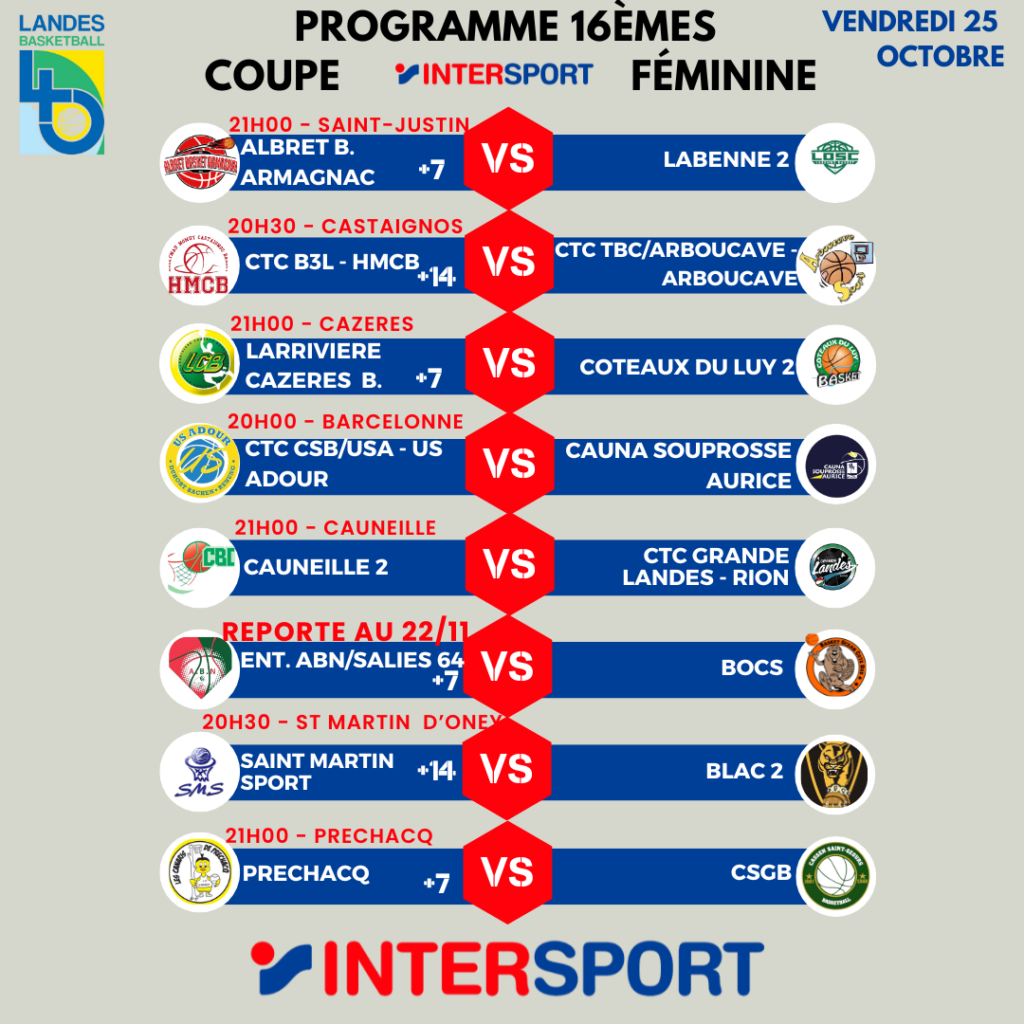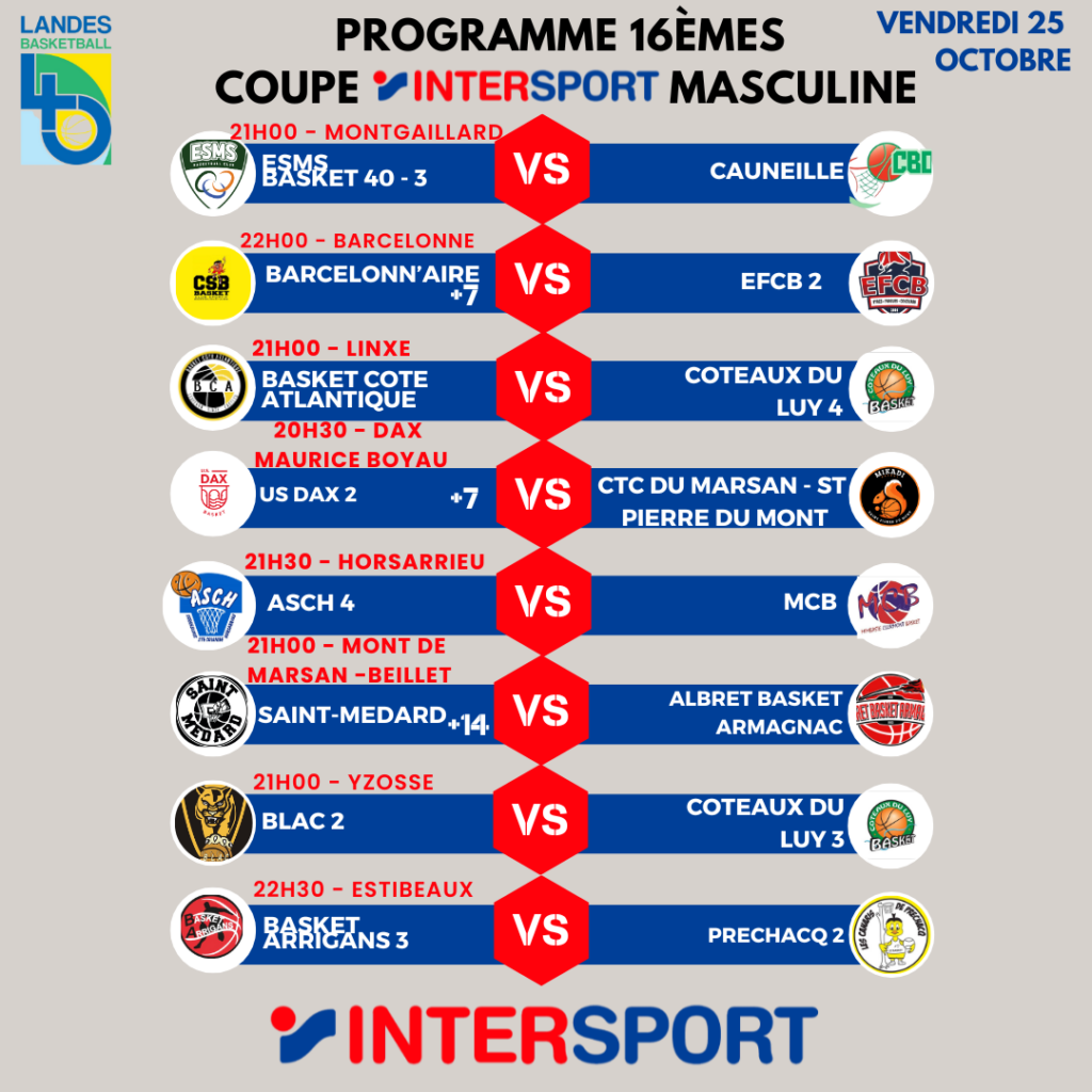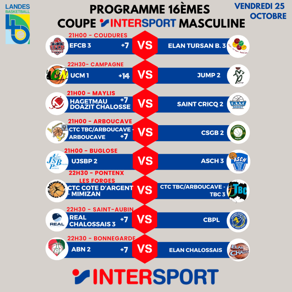 Les 16èmes de finale COUPE INTERSPORT auront lieu ce VENDREDI 25 OCTOBRE.