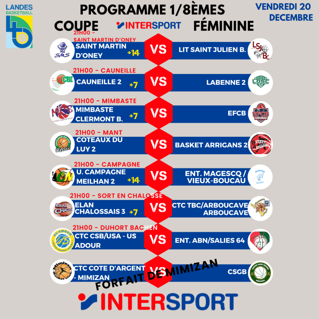 PROGRAMME 1/8èmes COUPE INTERSPORTPar Florian Lafargue / 17 décembre, 2024 Les 1/8èmes de finale COUPE INTERSPORT auront lieu ce VENDREDI 20 DECEMBRE. Retrouvez le programme complet de ces 1/8èmes ci-dessous. CSGB est d’ores et déjà qualifiée suite au forfait de la CTC COTE D’ARGENT MIMIZAN.