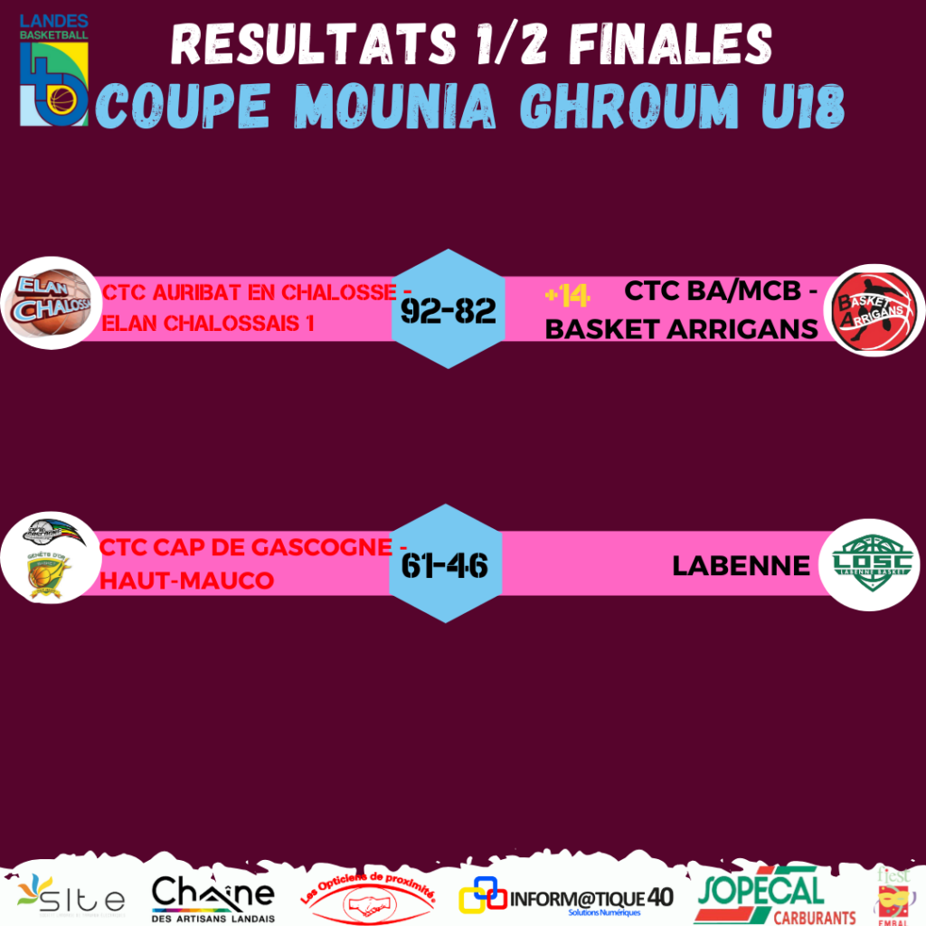 - 14H00 – Finale Coupe Mounia Ghroum U18F => CTC AURIBAT EN CHALOSSE 1 EC vs CTC CAP DE GASCOGNE 2 HAUT-MAUCO +7