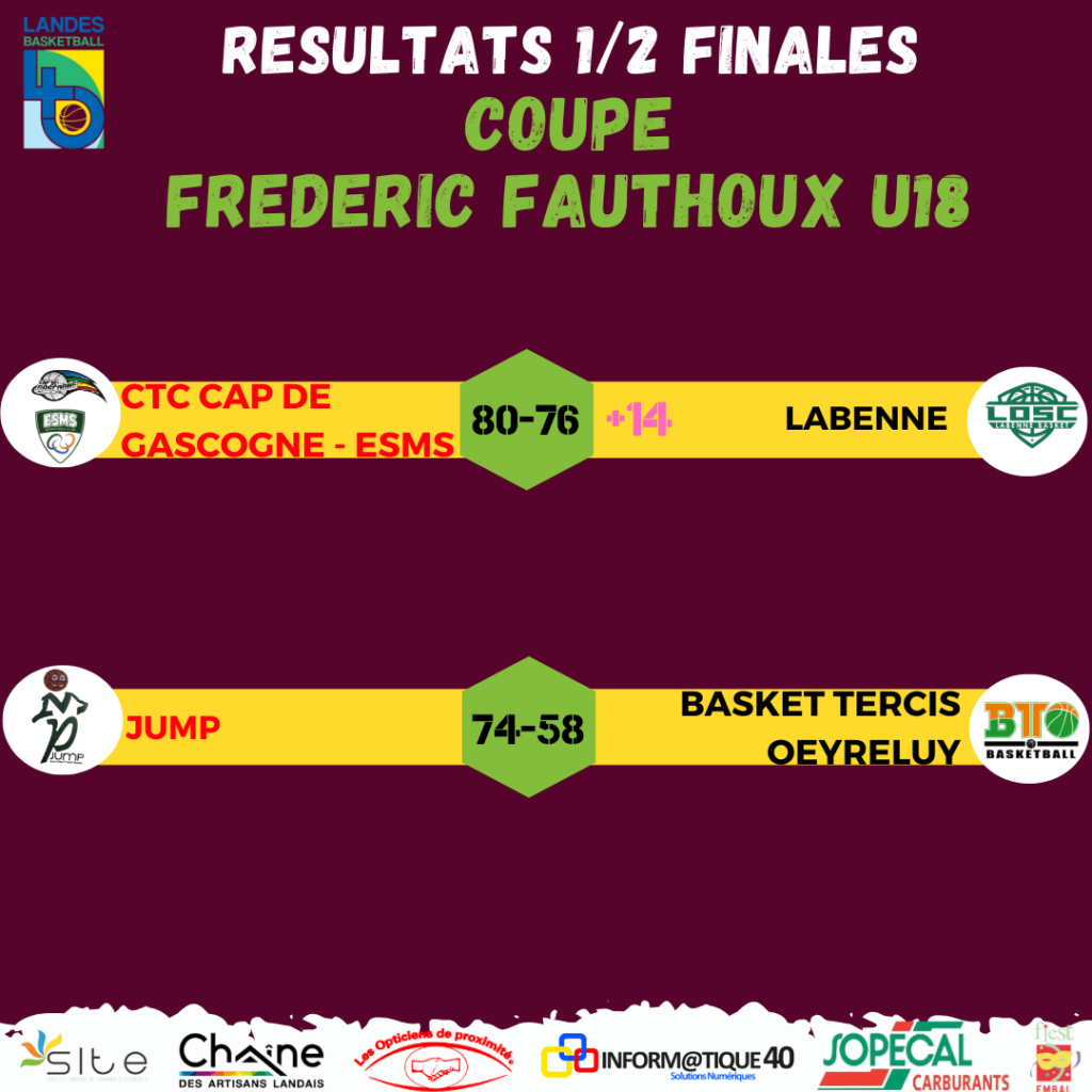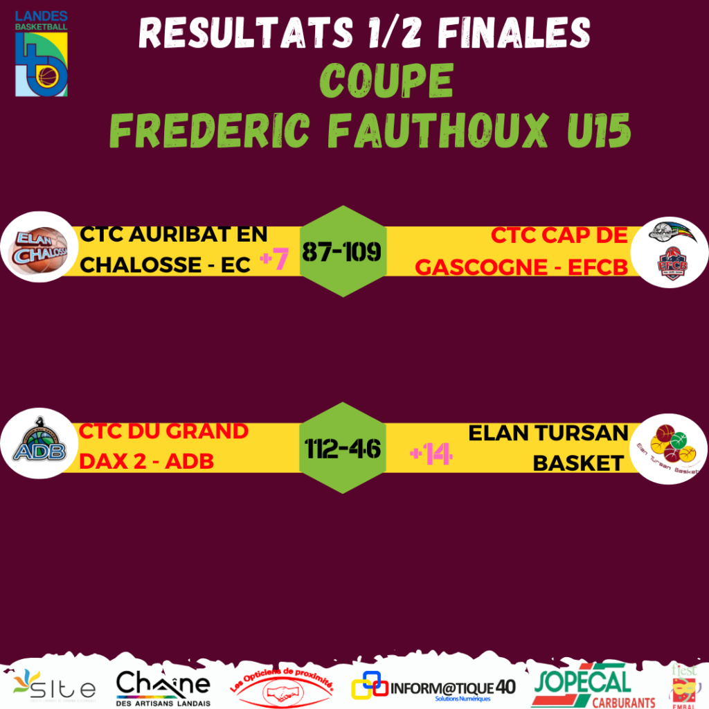 - 12H00 – Finale Coupe Frédéric Fauthoux U15M => CTC DU GRAND DAX 2 ADB vs CTC CAP DE GASCOGNE 1 EFCB