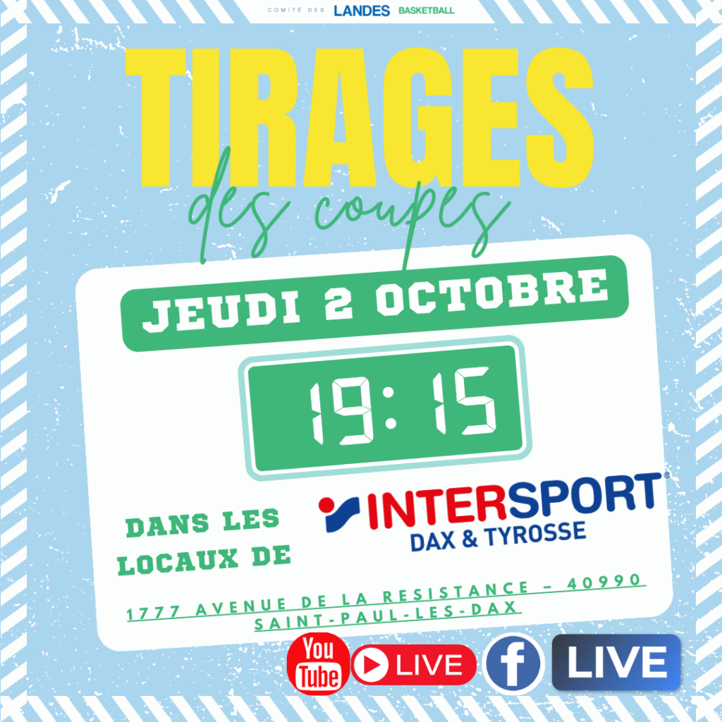 Les tirages des différentes coupes départementales auront lieu ce JEUDI 2 OCTOBRE à 19H15 au sein du magasin INTERSPORT de Saint-Paul-Lès-Dax.
