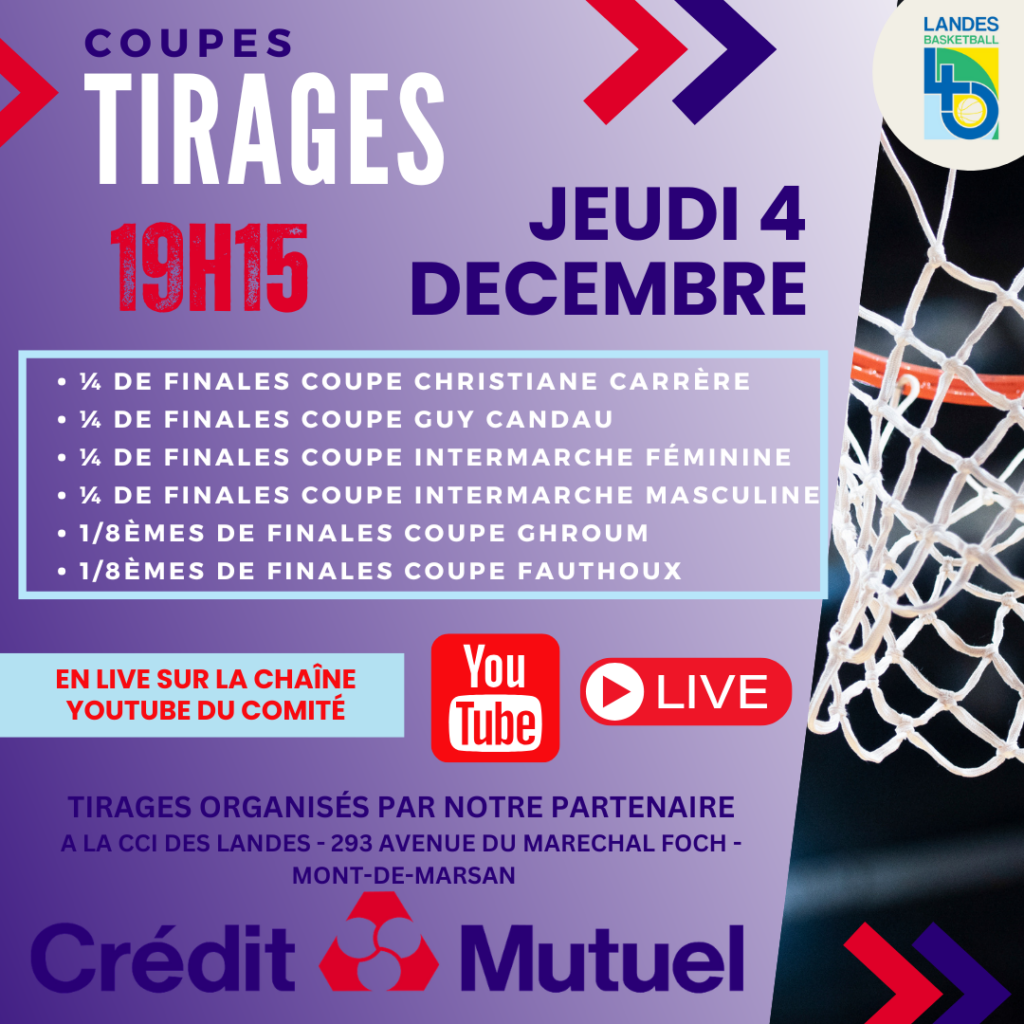 Les tirages ouverts aux clubs et au public, seront également diffusés en direct sur la chaine YOUTUBE du COMITE DES LANDES DE BASKET.