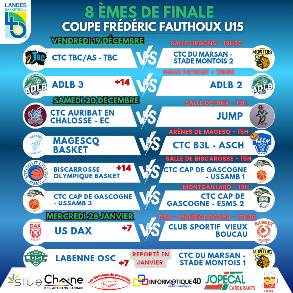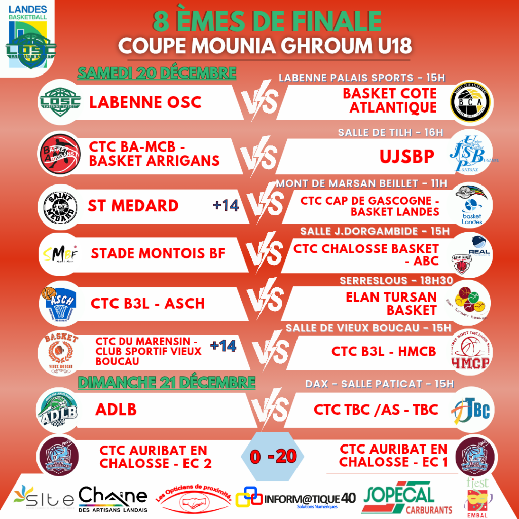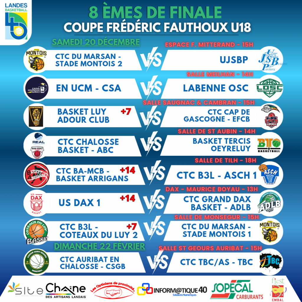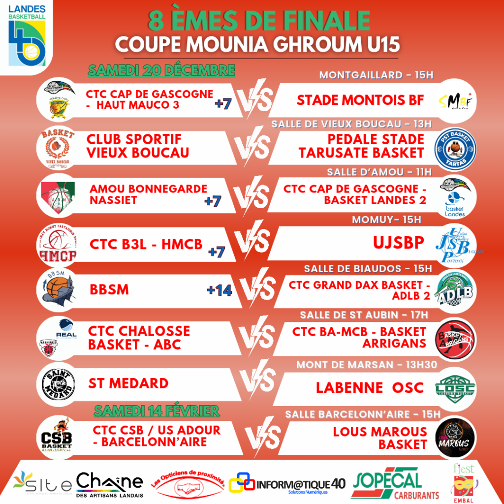 Retrouvez le programme complet des 1/8èmes de Finale Coupe Mounia Ghroum U15 & U18 & Coupe Frédéric Fauthoux U15 & U18 !