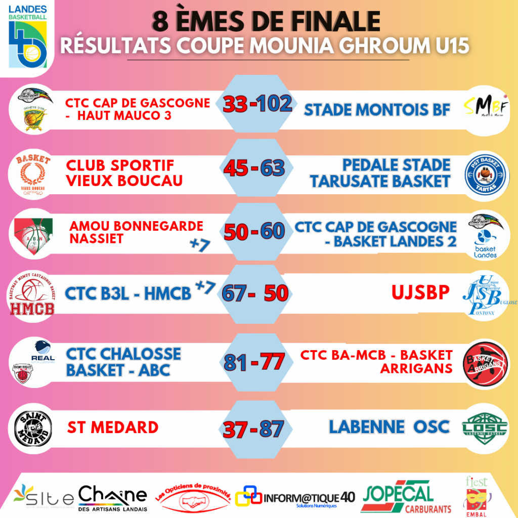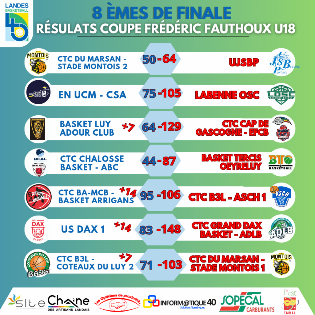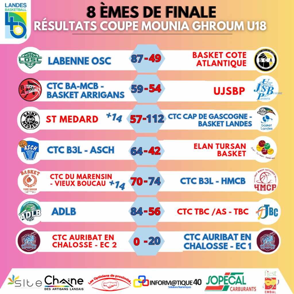 Résultats qui vous sont présentés par nos partenaires de cette compétiton : SLTE / Informatique40 / Les Opticiens De Proximité / La Chaine Des Artisans Landais / Sopecal Carburants & Fiest’Embal