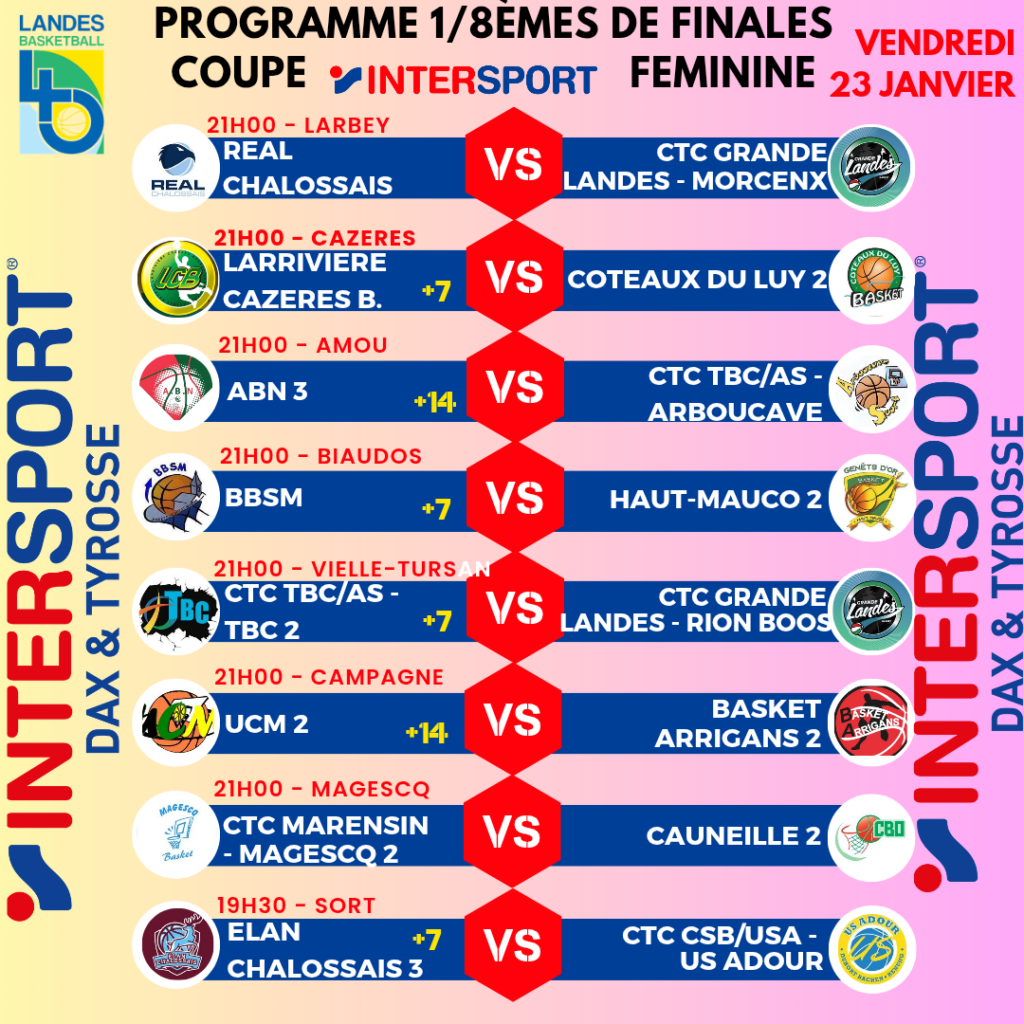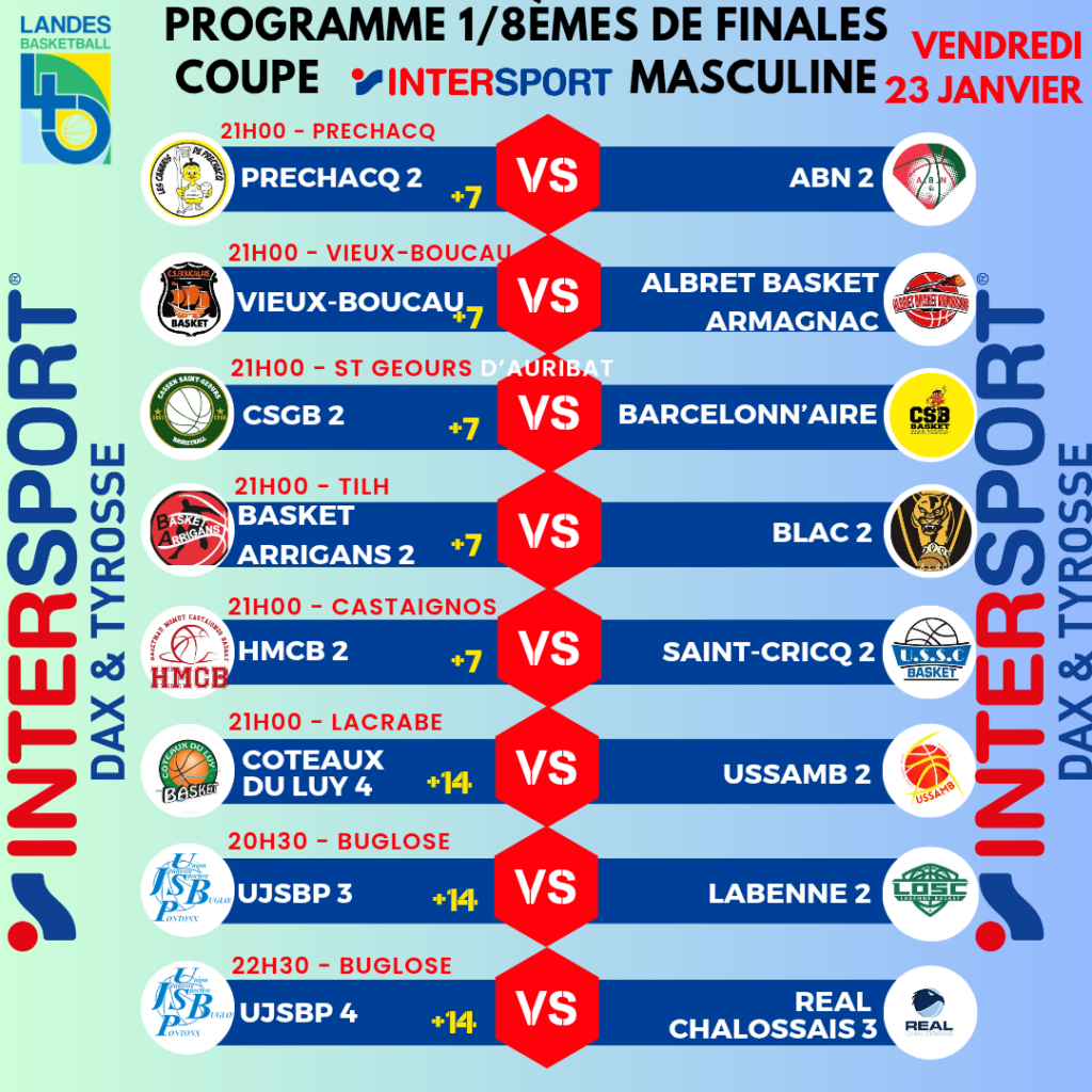 C’est le retour de la COUPE INTERSPORT Dax ! RDV ce Vendredi 23 Janvier pour les 1/8 èmes de finales de la compétition !