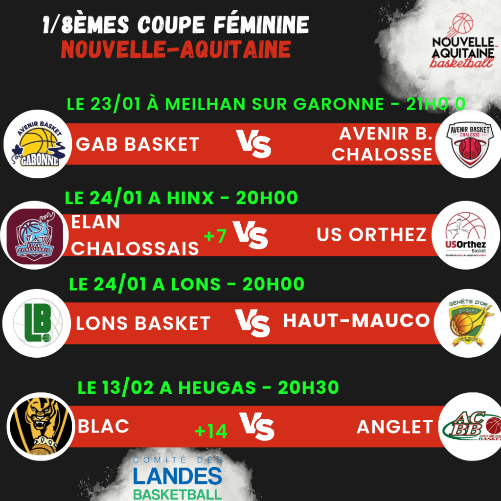 7 équipes Landaises chez les masculins, 4 équipes féminines pour la Coupe Nouvelle Aquitaine. A vos pronostics ! Qui sera au rdv des 1/4 de finales mi-mars ?