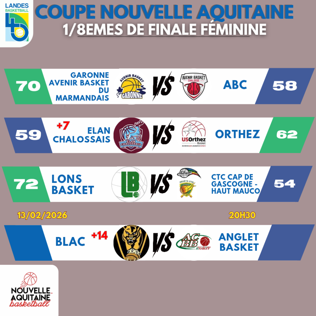 Retrouvez l’ensemble des résultats de nos équipes Landaises pour ces 1/8 èmes de Coupe Sud-Ouest masculine et de Coupe Nouvelle-Aquitaine Féminine.