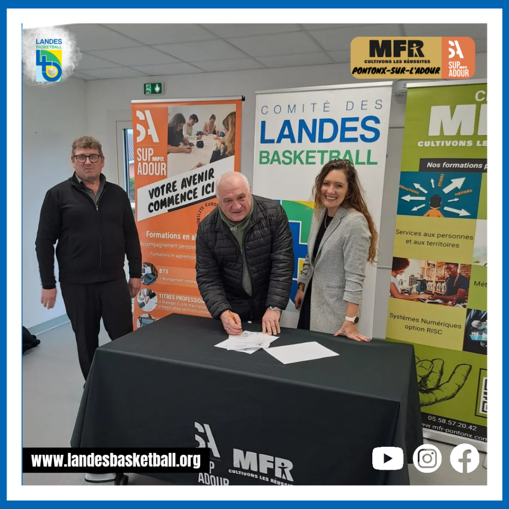 En ce début de semaine, dans les locaux de la MFR, JEAN-MARIE DARBAYAN (Président du Conseil d’Administration de la MFR) & ALAIN DELMAS (Directeur de la MFR) ont validé officiellement ce partenariat en présence de BARBARA CANLORBE (Présidente du Comité des Landes)