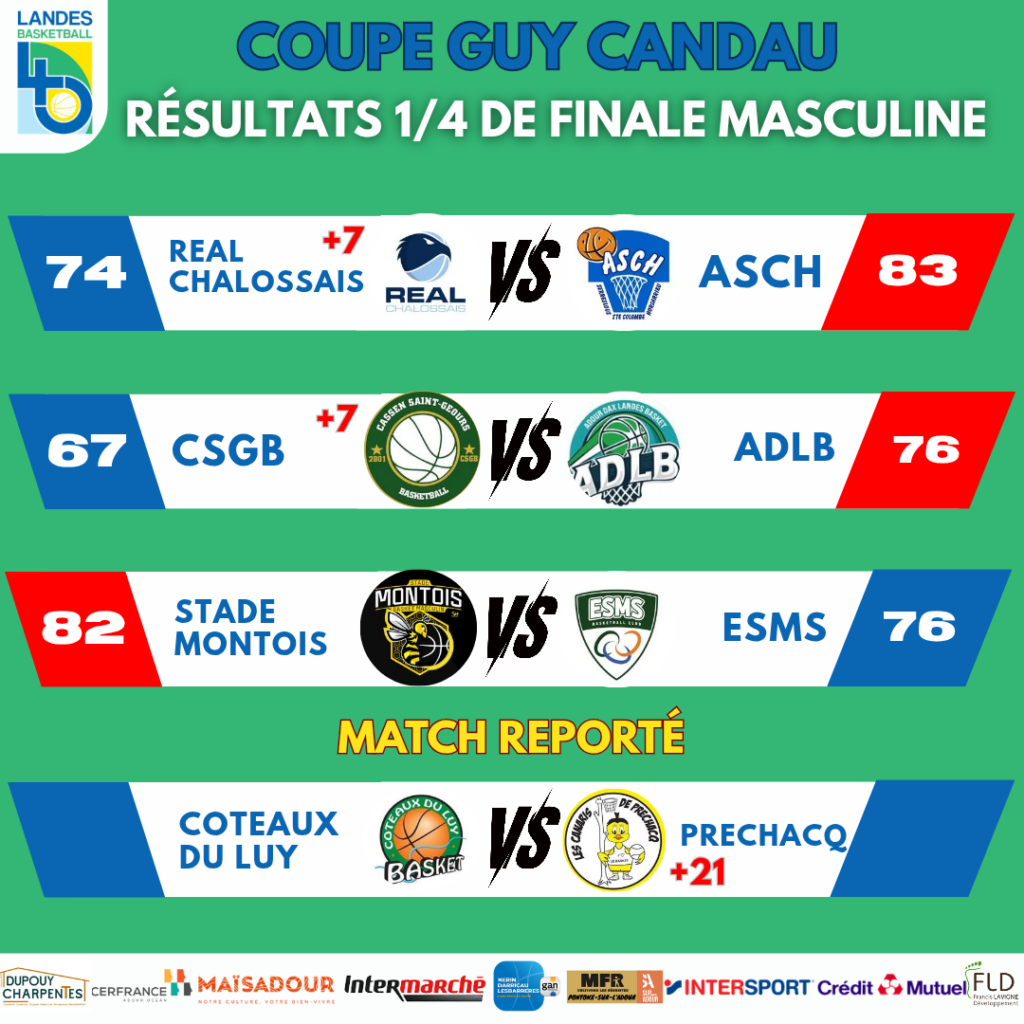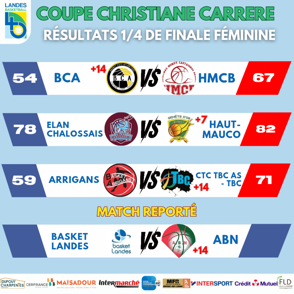 Retrouvez dès à présent les résultats des 1/4 de finale de Coupe des Landes joués ce week-end! Un plateau reporté sera joué probablement au mois de Mars.