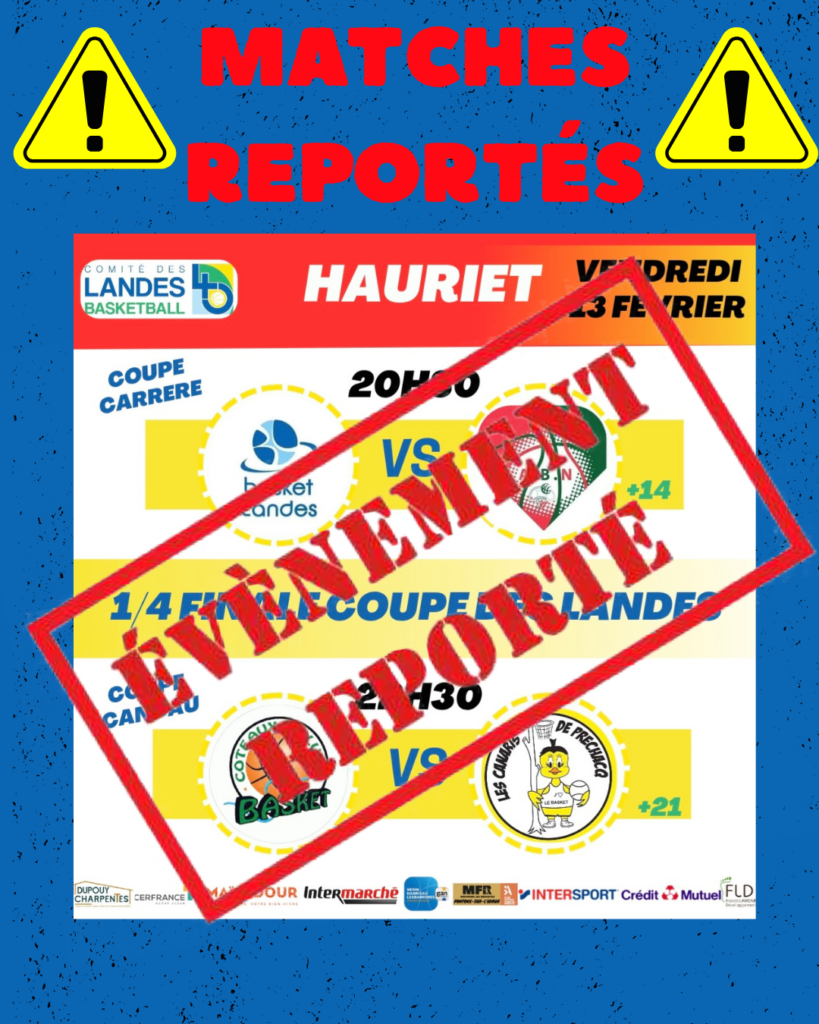 Initialement programmé ce Vendredi soir à Hauriet, le plateau accueillant la rencontre féminine Espoirs de Basket vs ABN et la rencontre masculine Coteaux du Luy vs Prechacq est reporté à une date ultérieure.