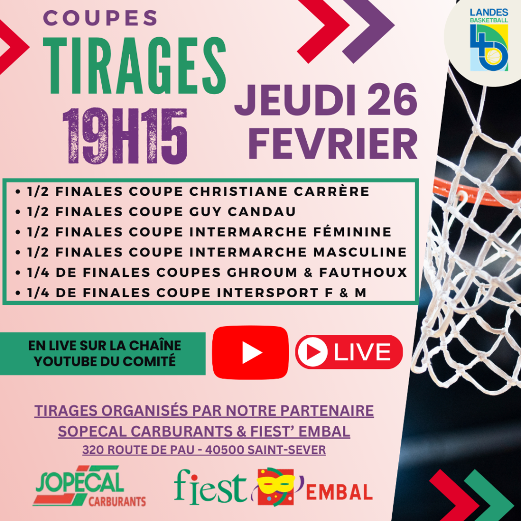 Les tirages des coupes départementales (1/2 finales Coupe des Landes, 1/2 finales Coupe Intermarché, 1/4 de finales Coupes Mounia Ghroum & Frédéric Fauthoux, 1/4 de finales Coupe Intersport) auront lieu le jeudi 26 février à 19h15 dans les locaux de Sopecal Carburants à Saint-Sever.